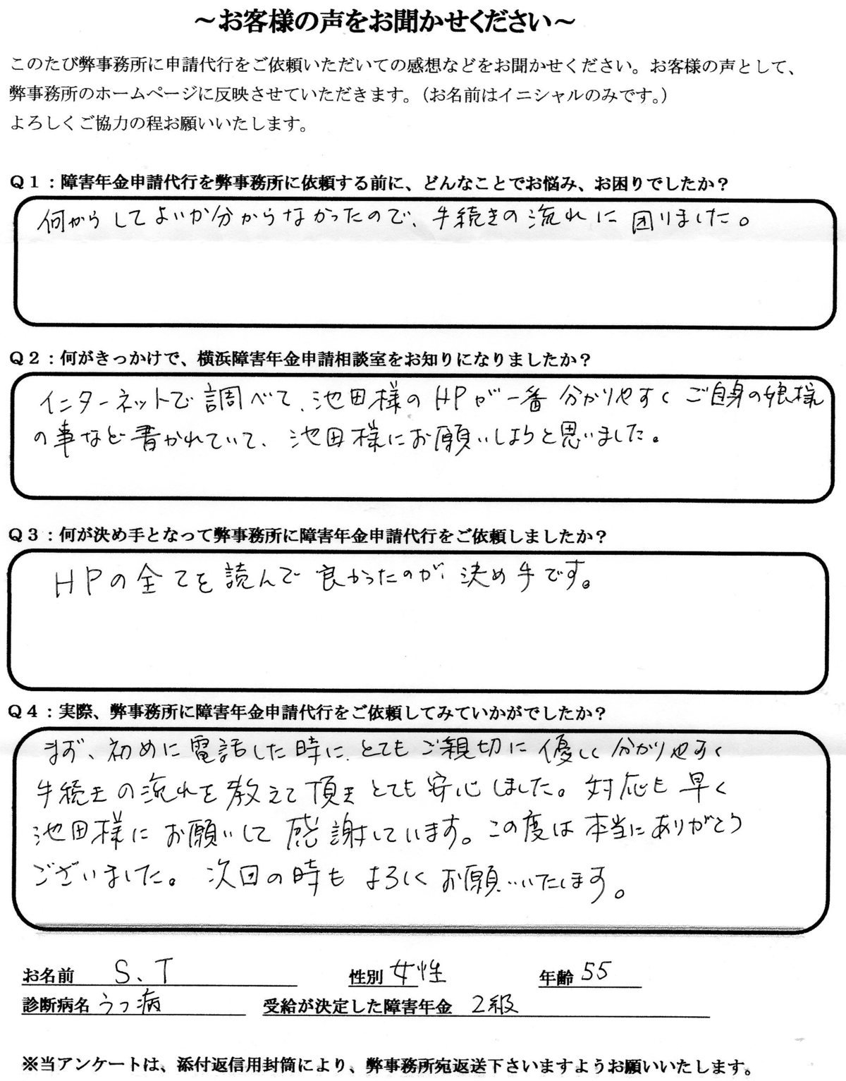 インターネットで検索した結果、貴事務所のホームページにたどり着きました。「横浜」「精神」「障害年金」などの検索用語でいろいろなH・Pを見ましたが、その中で一番信頼できそうな印象でした。